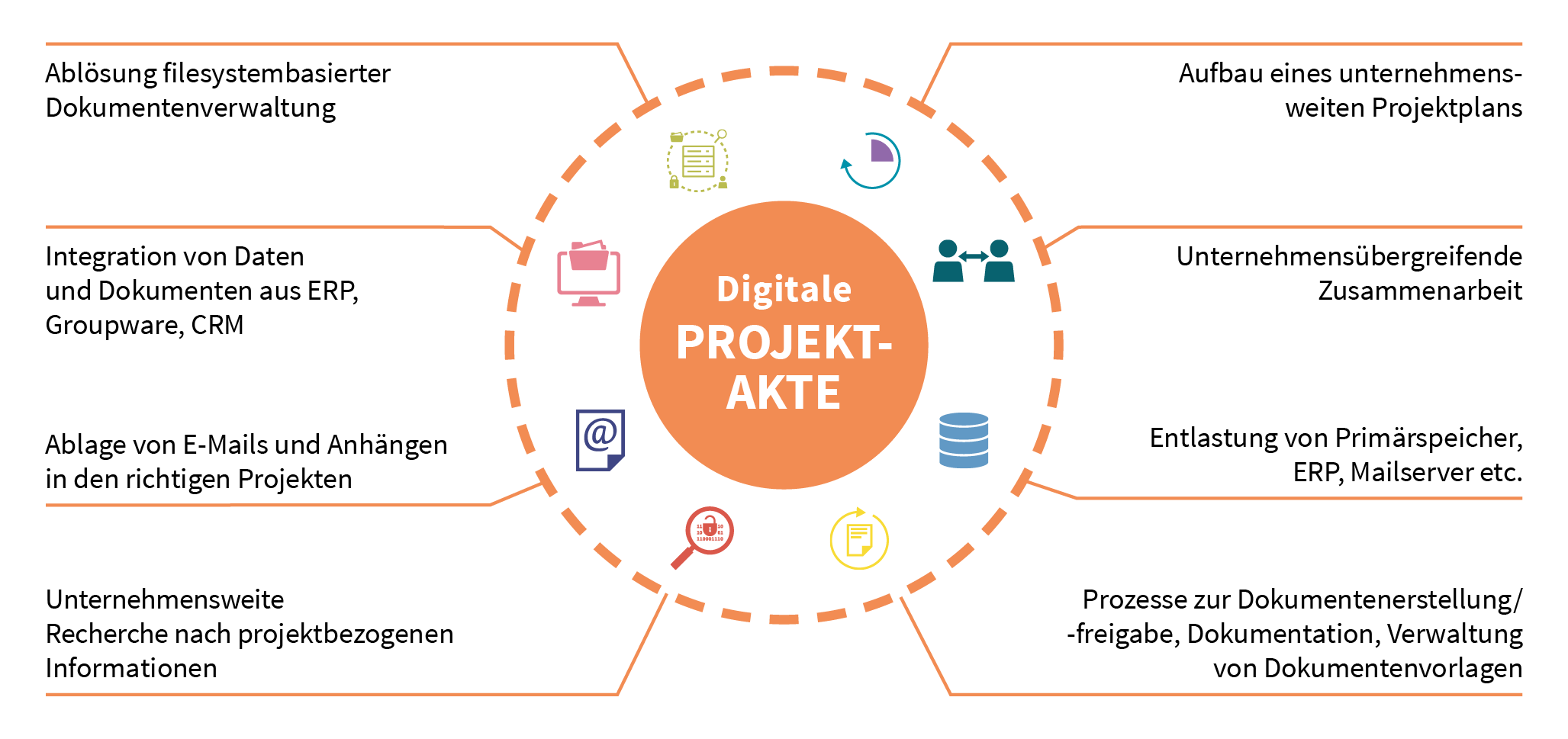 In der Akte werden alle notwendigen Informationen übersichtlich zusammengeführt. Für das Projekt notwendige Daten und Dokumente aus Systemen wie ERP, FiBu, CRM oder CAD werden redundanzfrei, zentral und sicher verwaltet. E-Mails und ihre Anhänge werden archiviert und im richtigen Kontext abgelegt und stehen allen Projektteilnehmern zur Verfügung. Funktionen wie Abonnements, Wiedervorlagen und ein Fristenmanagement erleichtern die Zusammenarbeit. Über den Projektstatus sind Geschäftsführung, Management und Projektleiter jederzeit informiert. Sie bringen sich – ohne aufwendige Meetings – durch automatisch generierte Reports detailliert auf den aktuellen Stand.