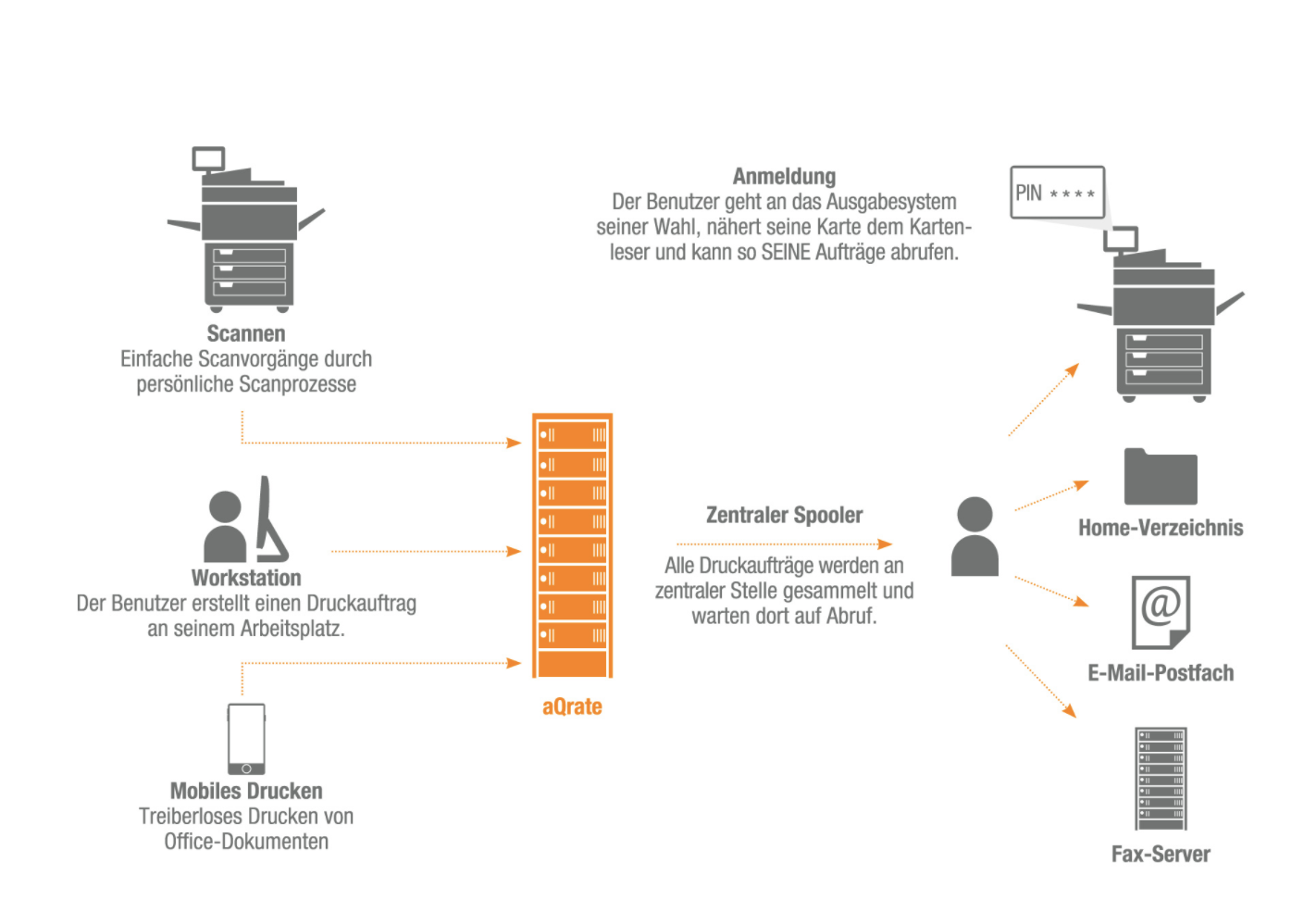 aQrate hilft, die diversen Drucksysteme optimal auszulasten, indem beispielsweise Druckaufträge besser verteilt werden. Die können per PC, Tablet oder Smartphone an den MFP der Wahl gesendet und anschliessend abgeholt werden. Gescannte Dokumente lassen sich mit einem Knopfdruck direkt an die eigene E-Mail oder ins persönliche Verzeichnis verschicken.