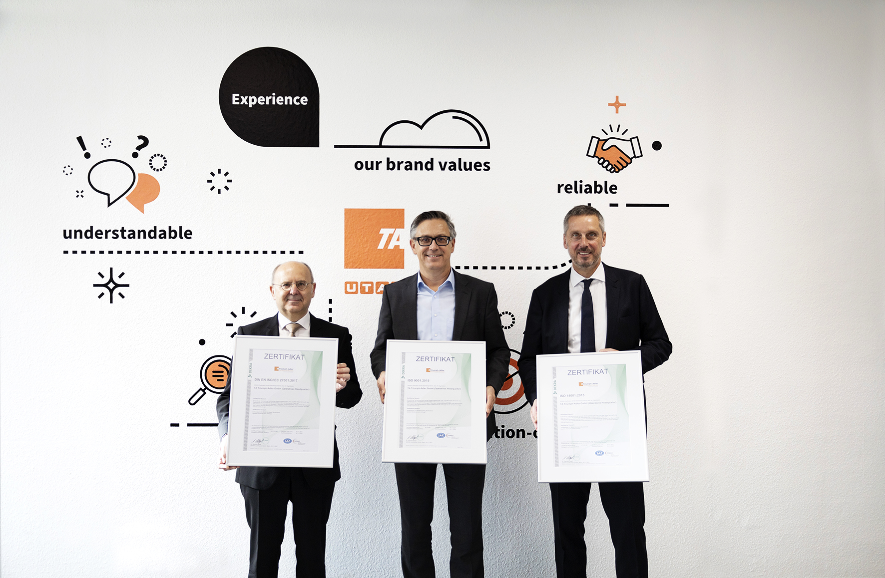 Seit Jahren arbeitet TA Triumph-Adler somit daran, die Informationssicherheit kontinuierlich zu erhöhen und ganzheitlich zu verbessern. Als Folge seines umfassenden Engagements hat TA Triumph-Adler von der DEKRA die Zertifizierung ISO 27001 (Informationssicherheitsmanagement) für die Standorte in Bonn, Dortmund, Fellbach, Hamburg, Hamburg-Altenwerder, Mainz, Nürnberg und Schwerin erhalten. Ein bedeutender Meilenstein – denn das Unternehmen wurde für den Grossteil seiner Geschäftsbereiche zertifiziert. Unabhängig von der Zertifizierung wird die ISO 27001 heute an allen Standorten von TA Triumph-Adler umgesetzt.
