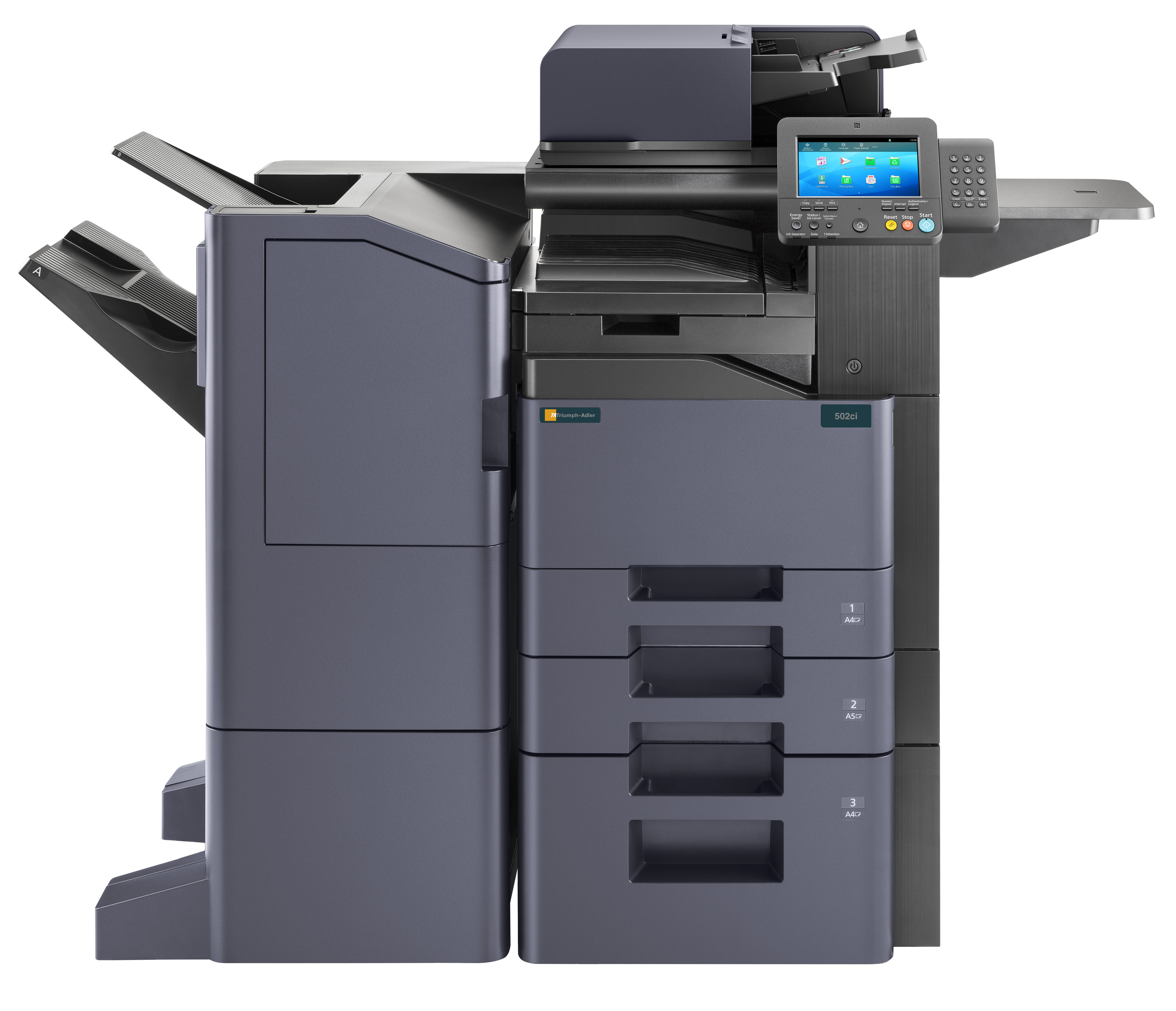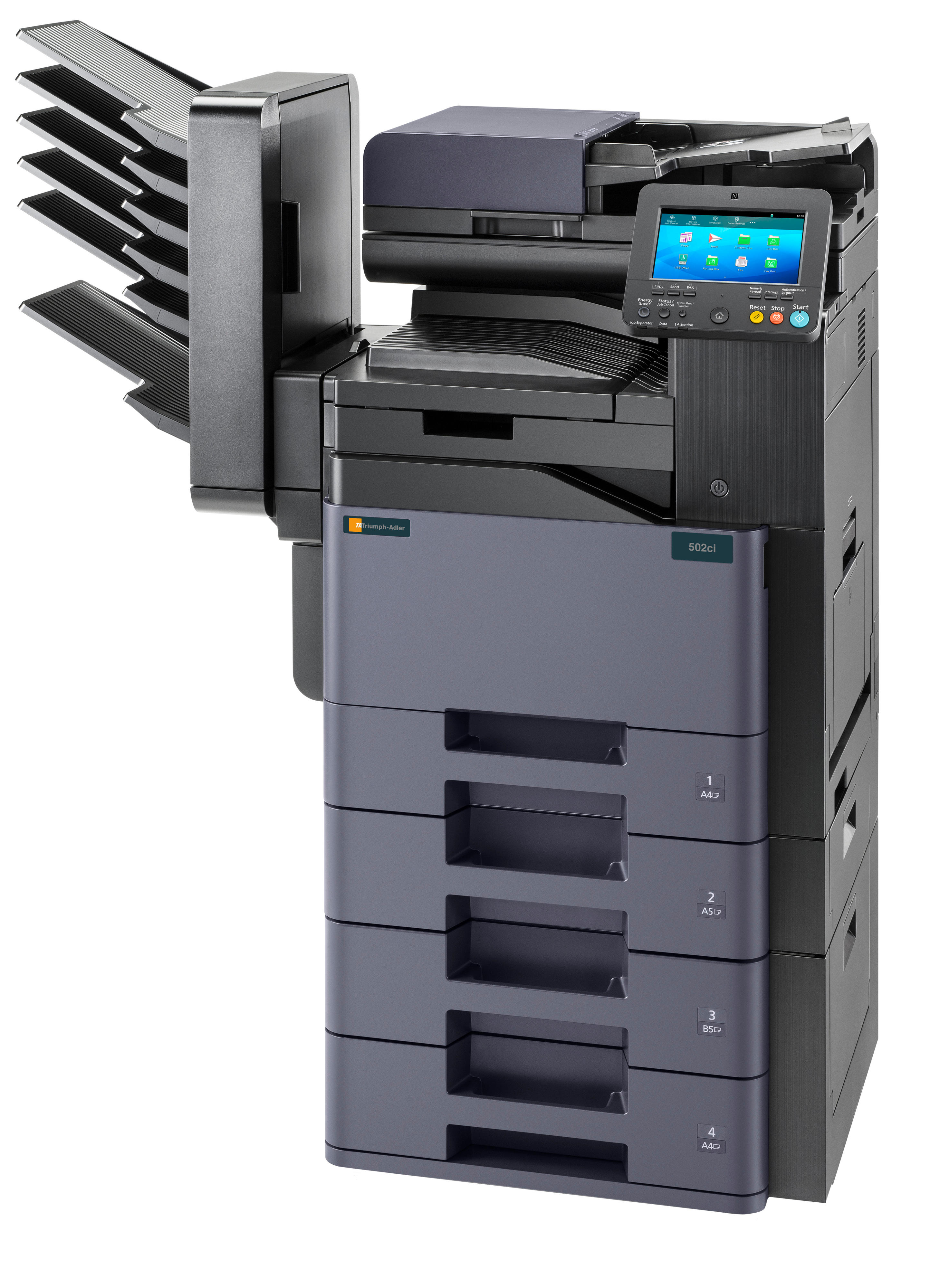 - FinisherDF-5100 Interner Finisher (Kapazität: 300 Blatt DIN A4, Heftung max. 50 Blatt DIN A4), DF-5110 (Kapazität: 1.000 Blatt DIN A4, Heftung max. 50 Blatt DIN A4), DF-5120 (Kapazität: 3.200 Blatt DIN A4, Heftung max. 50 Blatt DIN A4, manuelle Heftung ebenfalls möglich, 2-/4-fach Lochung), PH-5110 Locheinheit für DF-5110 (2-/4-fach Lochung), MT-5100 Multi Tray (500 Blatt + 5 x 100 Blatt DIN A4 (nicht mit DF-5100/DF-5110/DF-5120/JS-5100 kombinierbar!)