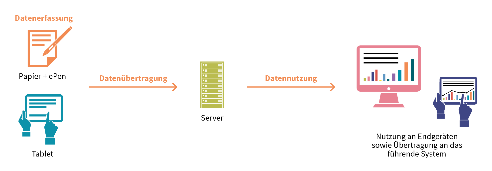 Die Übertragung der gespeicherten Daten erfolgt über eine USB-Dockingstation oder per Bluetooth (PC oder Smartphone) an den jeweiligen Rechner am Arbeitsplatz. Vorher muss der ePen an den Client angeschlossen werden. Mit der Client-Software wird der Datensatz bearbeitet und an den FormServer übertragen, der ihn verwaltet und archiviert. Das Punkteraster kann auf alle gängigen Formate (wie DIN A4, DIN A5 etc.) aufgedruckt werden.