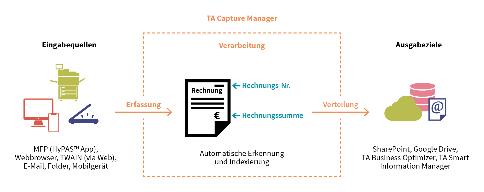 Der Bonus ist die Dokumentenerkennung. Der TA Capture Manager kann beispielsweise Rechnungsnummer und -betrag ausgewählter Rechnungssteller erkennen, die benötigten Daten extrahieren und sie entsprechend (strukturiert) ablegen. Damit entfällt das Suchen, wo genau die Rechnungen denn jetzt wohl abgespeichert sind. In diese Ordner kommen natürlich auch alle elektronisch eingehenden Dokumente.