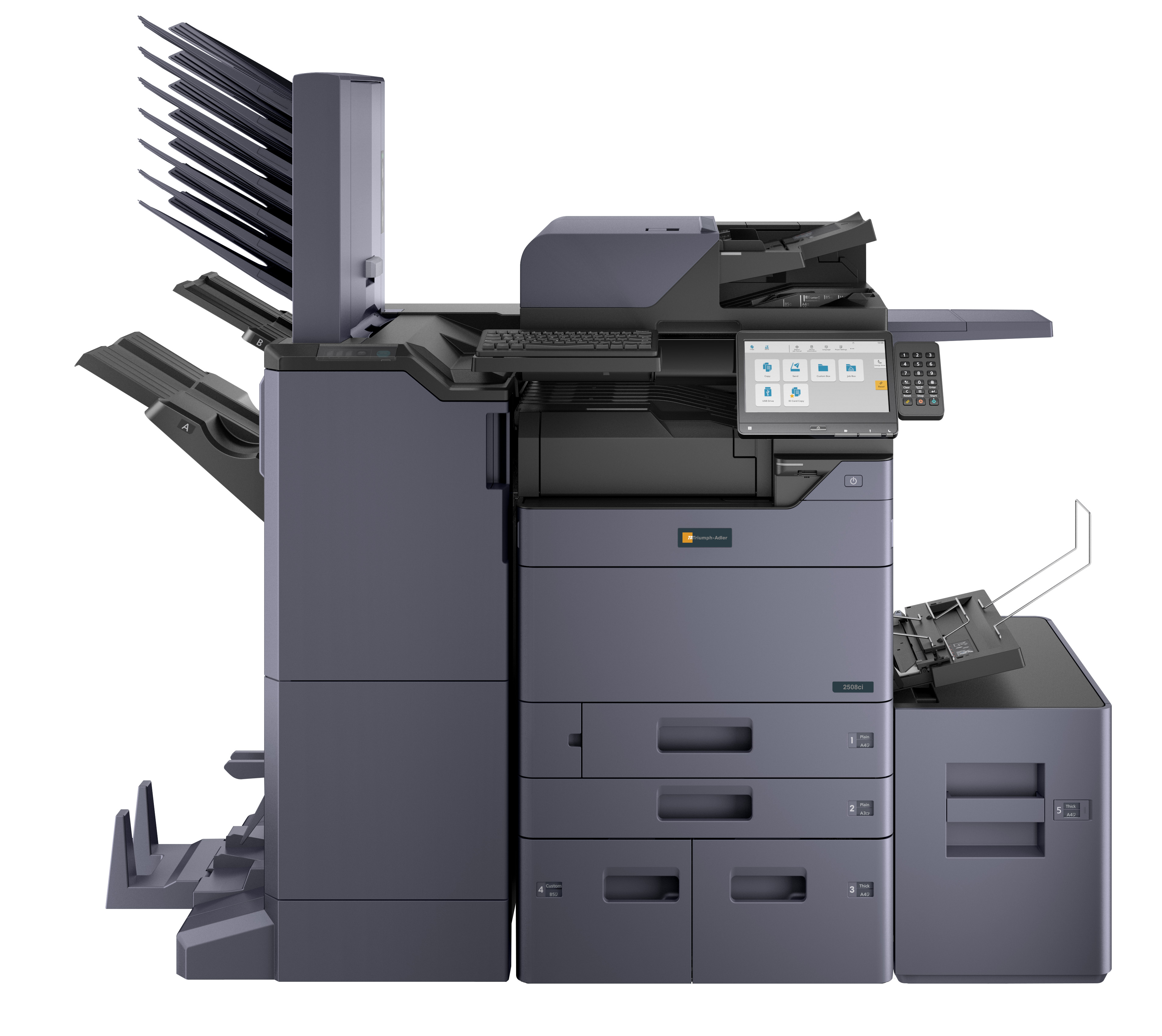 - FinisherDF-7100 internal finisher (capacity: 500 sheet A4, stapling max 50 sheet A4), DF-7120 (capacity: 1,000 sheet A4, stapling max 50 sheet A4),, PH-7120 hole punch unit for DF-7100, PH-7C hole punch unit for DF-7120/7140, PH-7C hole punch unit for DF-7120/7140, DF-7140 (capacity: 4,000 sheet A4, stapling max 65 sheet A4), BF-730 brochure module for DF-7140 (max 20 sheet saddle stitching and folding A4/A3, tri-folding max X sheet A4), MT- 730 (B) Multi Tray für DF-7140