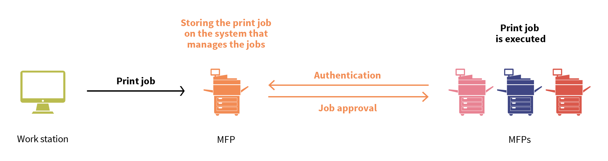 - No servers: all print jobs are stored in the Manager MFP.
