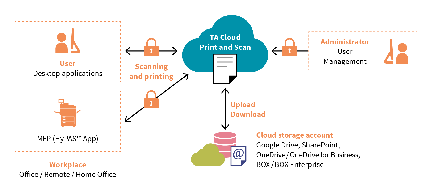 More and more companies realise that their data is more convenient, cheaper and even safer kept in the cloud. Now they can also send print and scan jobs via cloud: TA Cloud Print and Scan allows location-independent printing and scanning. The advantage of the solution is the high security standard: jobs are managed centrally in the cloud and processed in encrypted form. Printing only takes place when the employee has authenticated himself or herself directly at the multifunction printer (MFP) with a card, user name and password or PIN. This prevents printouts from falling into wrong hands.