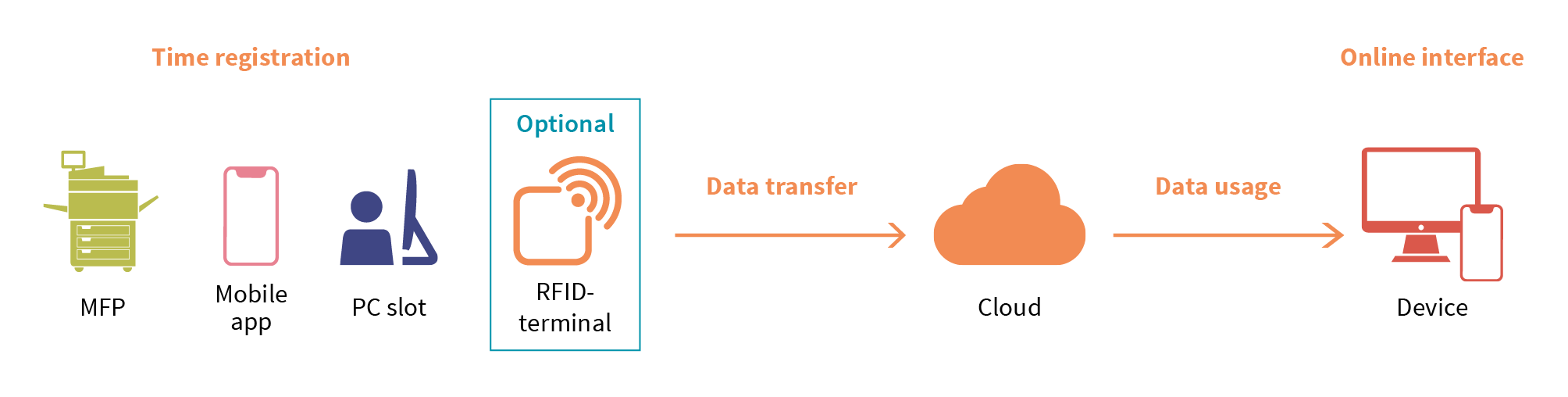 TA Zeitblick simplifies the recording of working times. As soon as the software is installed in the multifunction printer, every employee can reliably record the start and end of their working hours - almost in passing. And if it should not be the office printer: TA Zeitblick works just as easily at the PC workstation or via smartphone app.