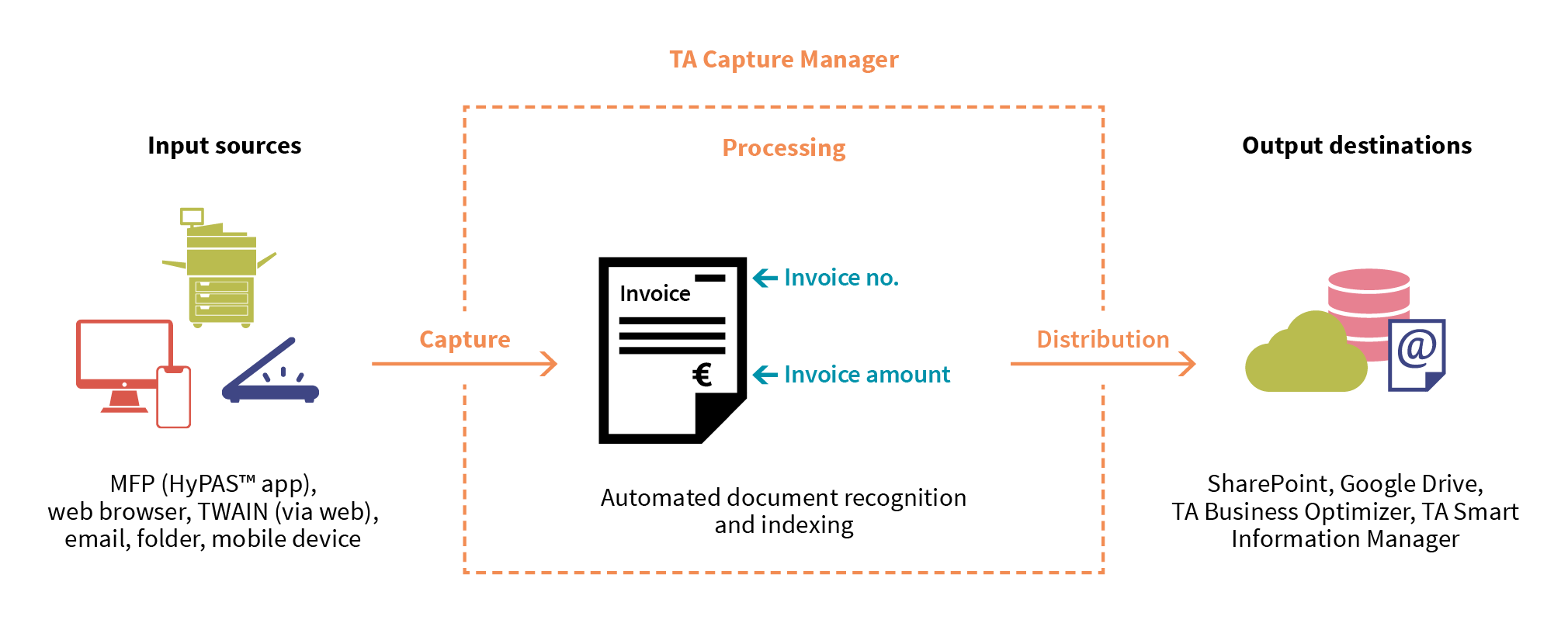 Paper will not disappear from offices for as long as invoices and delivery notes continue to arrive by post. This is a hindrance for companies that want to digitise their processes in order to ensure efficiency, transparency and more convenient workflows. So what can be done? It's simple: paper documents are scanned (and thus digitised) immediately and automatically filed in the correct folders so that staff can access them directly. TA Triumph-Adler has the ideal solutions for this: ScannerVision and TA Capture Manager.