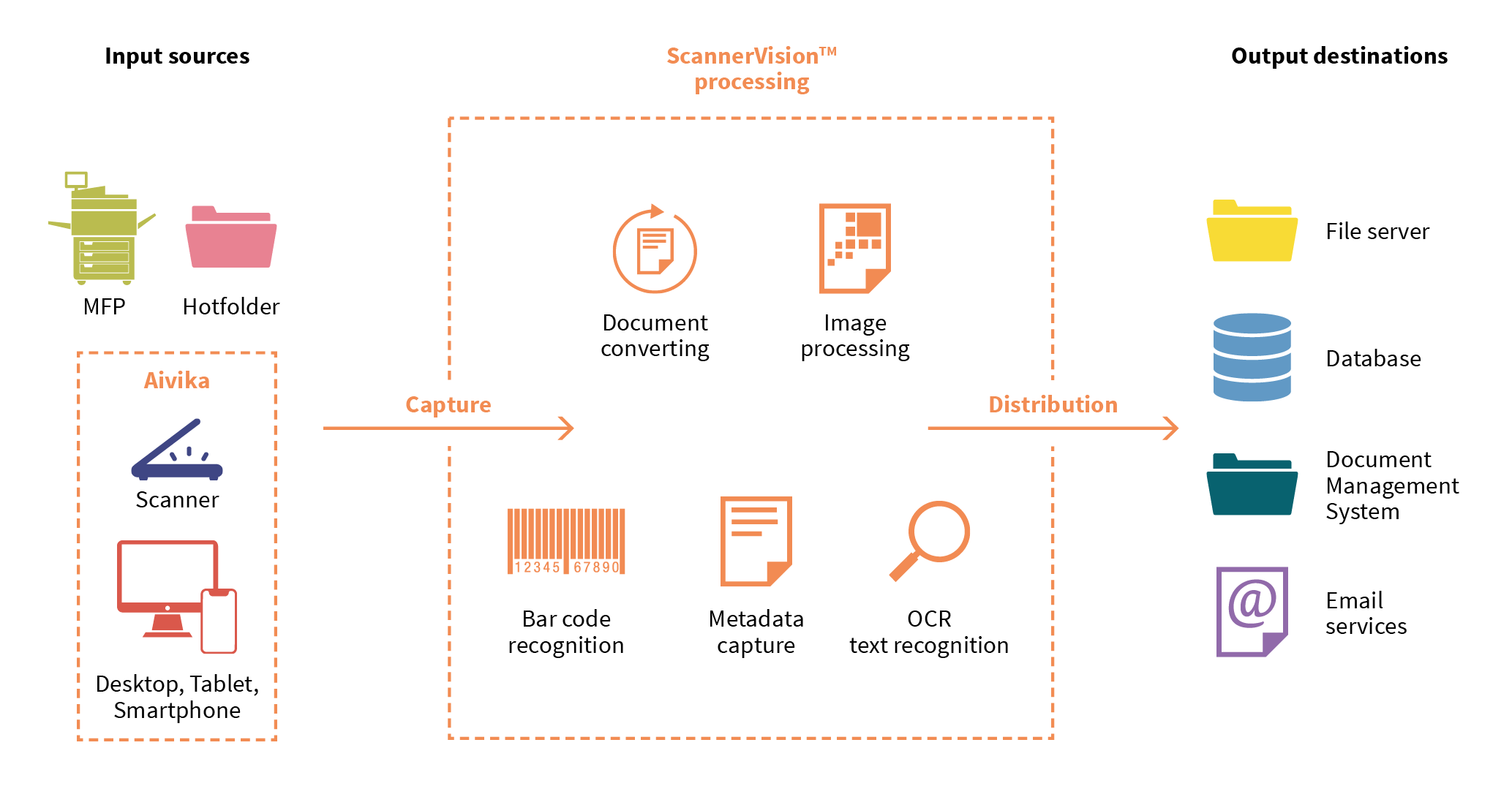 When equipped with ScannerVision, a multifunction printer (MFP) becomes an intelligent document manager that can capture, edit and distribute documents. ScannerVision makes sure that invoices and contracts, for example, are filed in a well-structured way and can be found easily. The universal workflow solution converts scans into editable files in Word or Excel, for example. This digitised data can easily be processed and managed in databases and in DMS or ECM systems. ScannerVision also recognises and processes barcode content and guarantees secure and encrypted data transmission. The menu navigation for scanning is simple and intuitive.