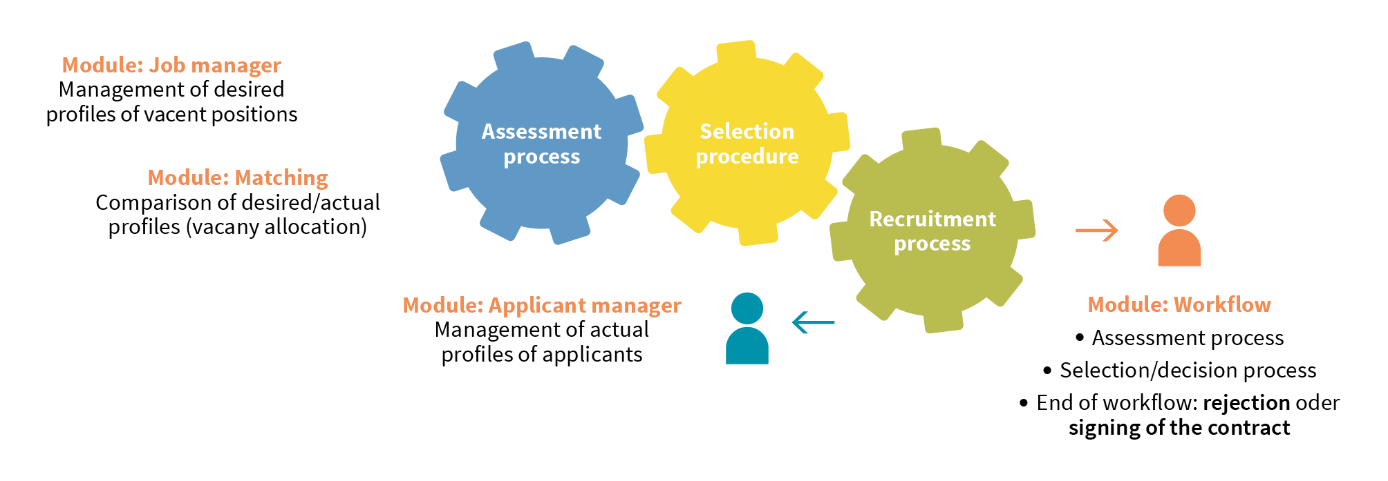 This ECM module can be used to sort applicants automatically into A, B and C candidates. AGG (General Equal Treatment Act) and data protection are more or less automatically observed. Publishing job offers can easily be automated by means of an extension for e-recruiting.